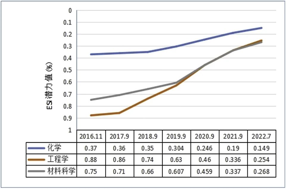 跟踪分析ESI优势学科发展趋势,推动化学、材料科学、工程学ESI排名持续提升。自2016年以来,化学学科由3.7‰提升到1.496‰,目前国际排名237;材料科学学科由7.5‰提升到2.682‰,目前国际排名306;工程学学科由8.8‰提升到2.543‰,目前国际排名503;其中化学学科冲千步伐不断加快,学科国际影响力不断提升。